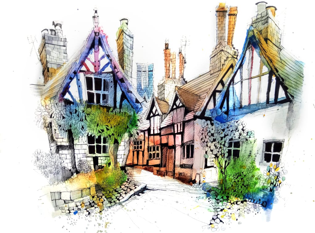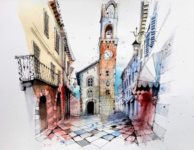 But here’s a challenge for you: the next time you sketch, hold off on painting the sky. Instead, shift your focus to what truly brings the scene to life—the textures of a doorway, the greenery spilling from a window, the interplay of shadows on a wall.