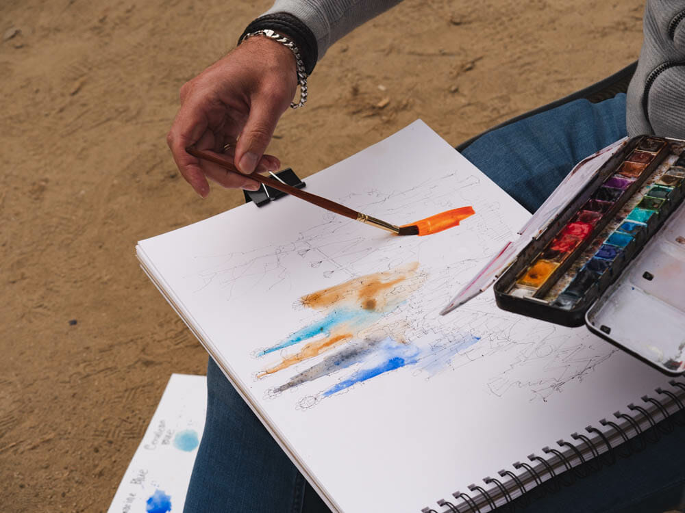 We recommend that you bring with you an A3 Sketchbook, your watercolour paints and brushes, a small pot for water, brush pens and fine liners, a small chair to sit on, drinking water, sunscreen, and a raincoat and your best sketching attitude!